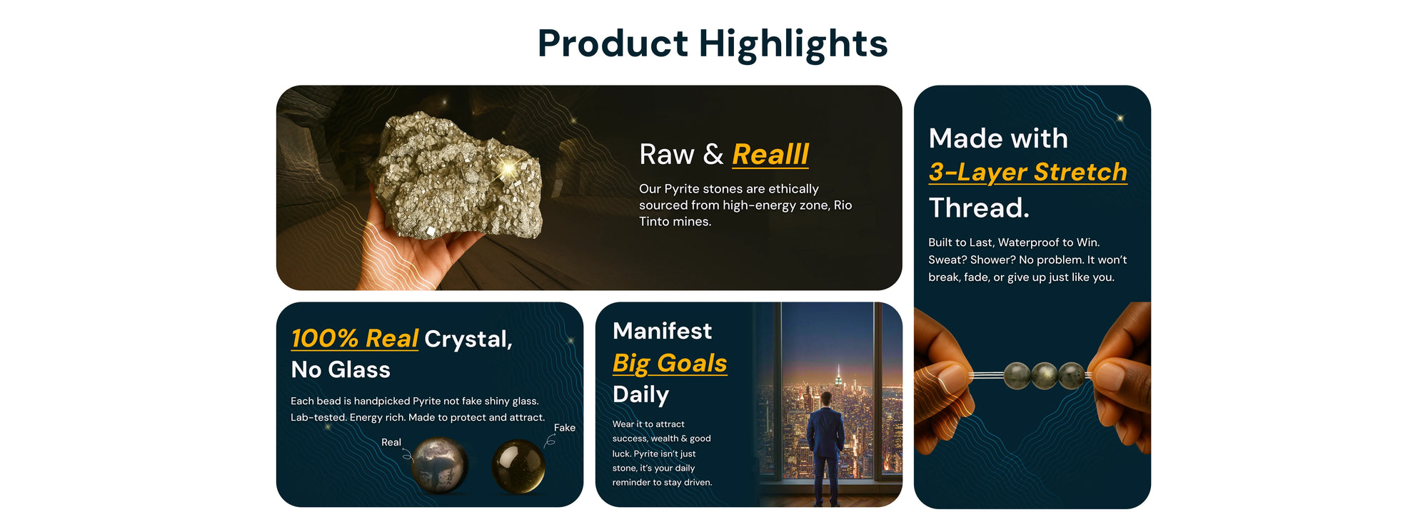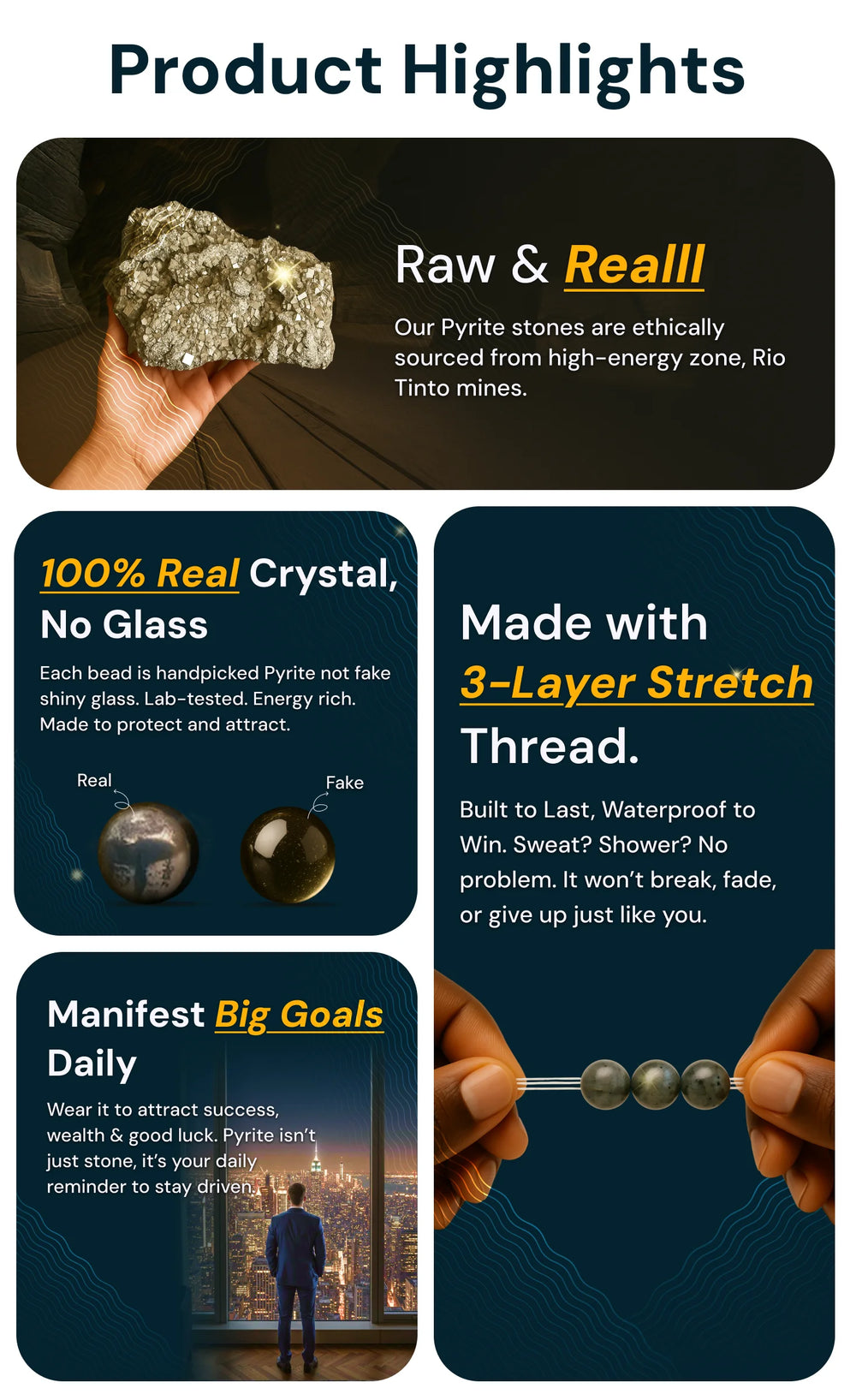 The Pyrite Bracelet attracts abundance, protects your aura from negativity, and fills you with bold, success-driven energy.