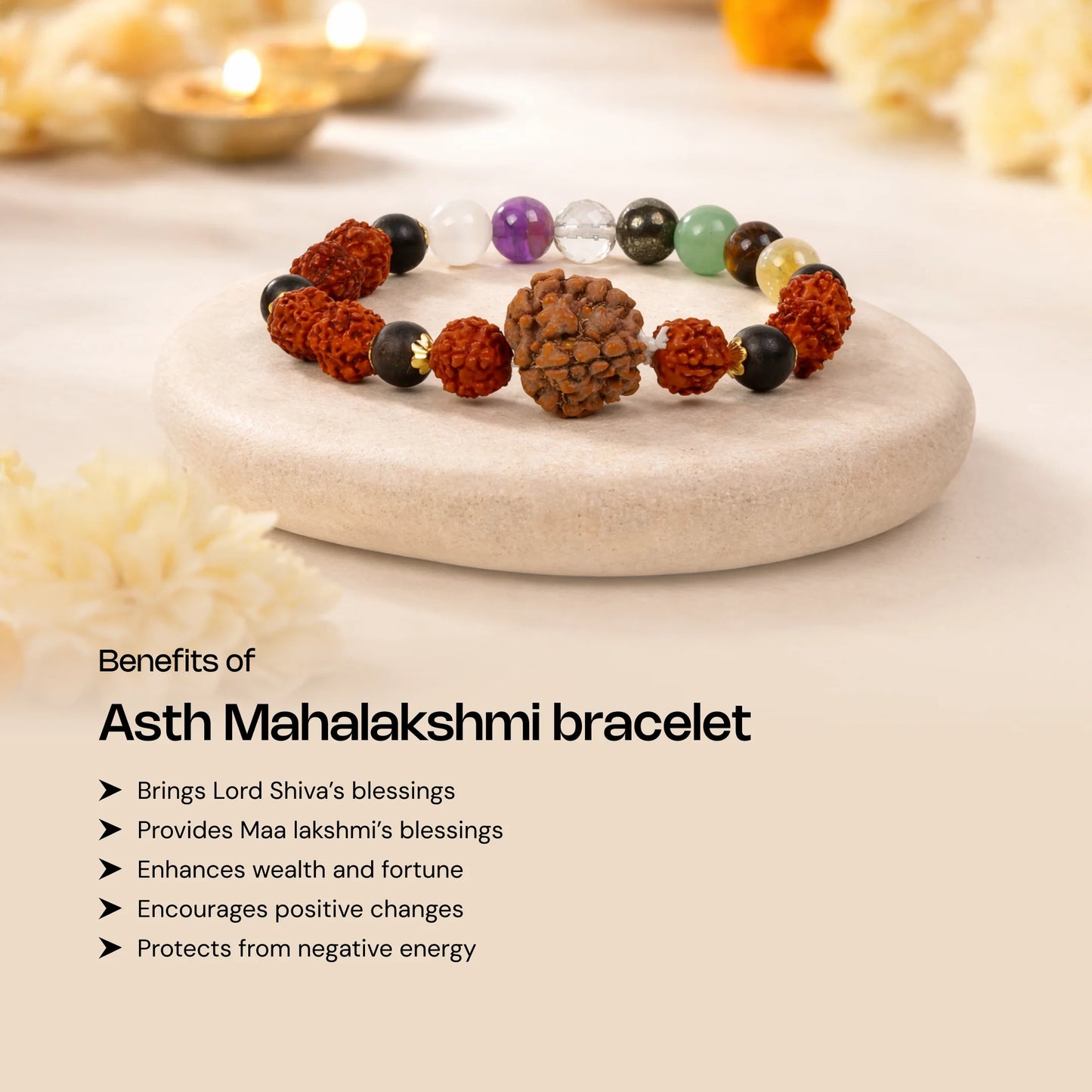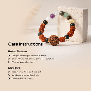 The Asth Lakshmi Maha Dhanyog Bracelet blends sacred 7 mukhi Rudraksha bead, 5 mukhi Rudraksha beads, Sphatik, Citrine, Selenite, Amethyst, Crystal, Pyrite, Green aventurine, and Karungali beads with an elegant silver chain to bring peace, protection, wealth, and prosperity into your life. Inspired by the divine energy of Goddess Lakshmi, it clears negative vibes, deepens inner calm, and uplifts your spirit. Wearing it daily strengthens your focus, invites abundance, and supports emotional balance and well‑being.