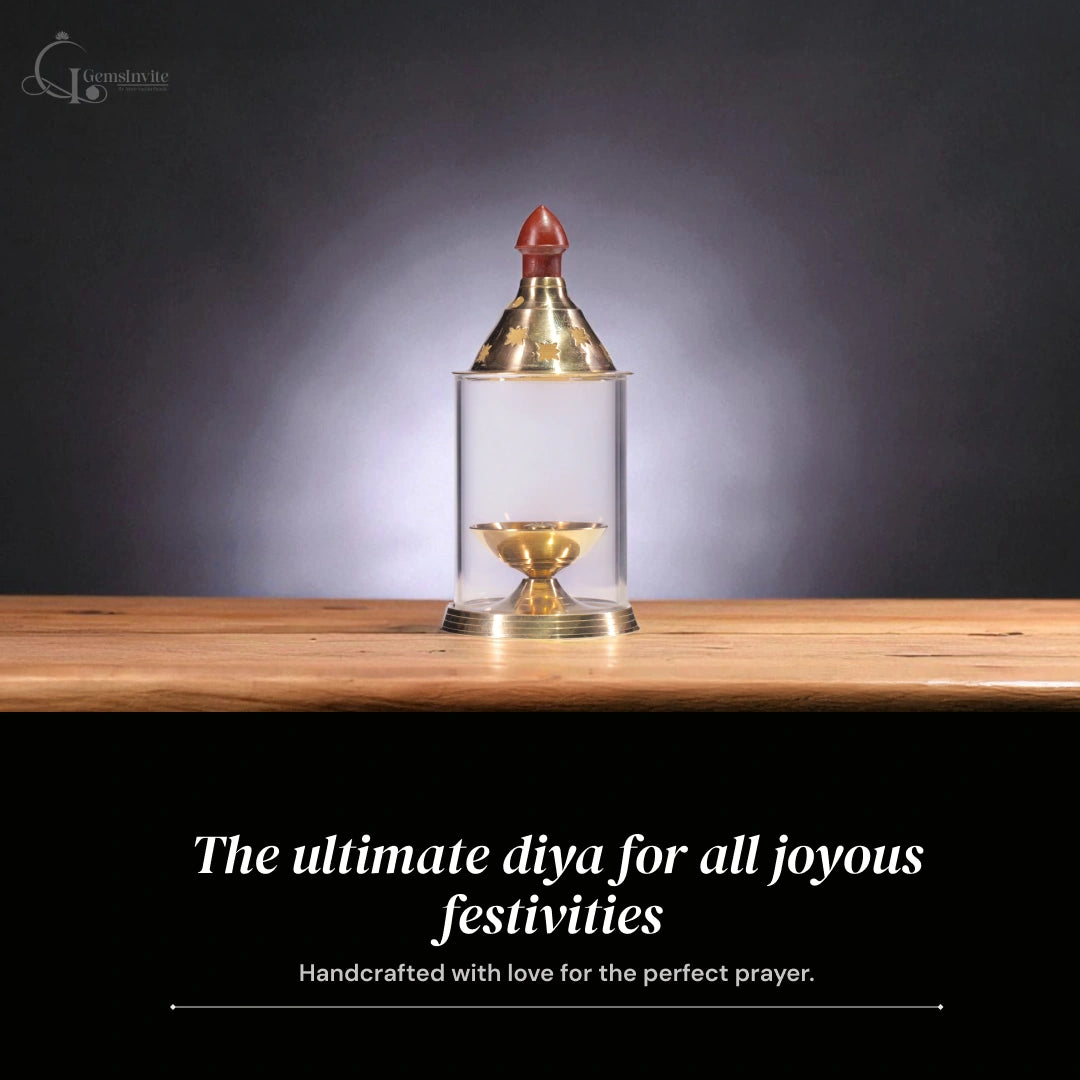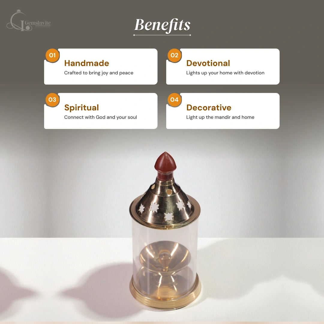 Regular price Rs. 249.00This brass Akhand Jyoti Diya with glass cover keeps your sacred flame glowing longer. It fills your home with peace, positivity, and divine blessings. (