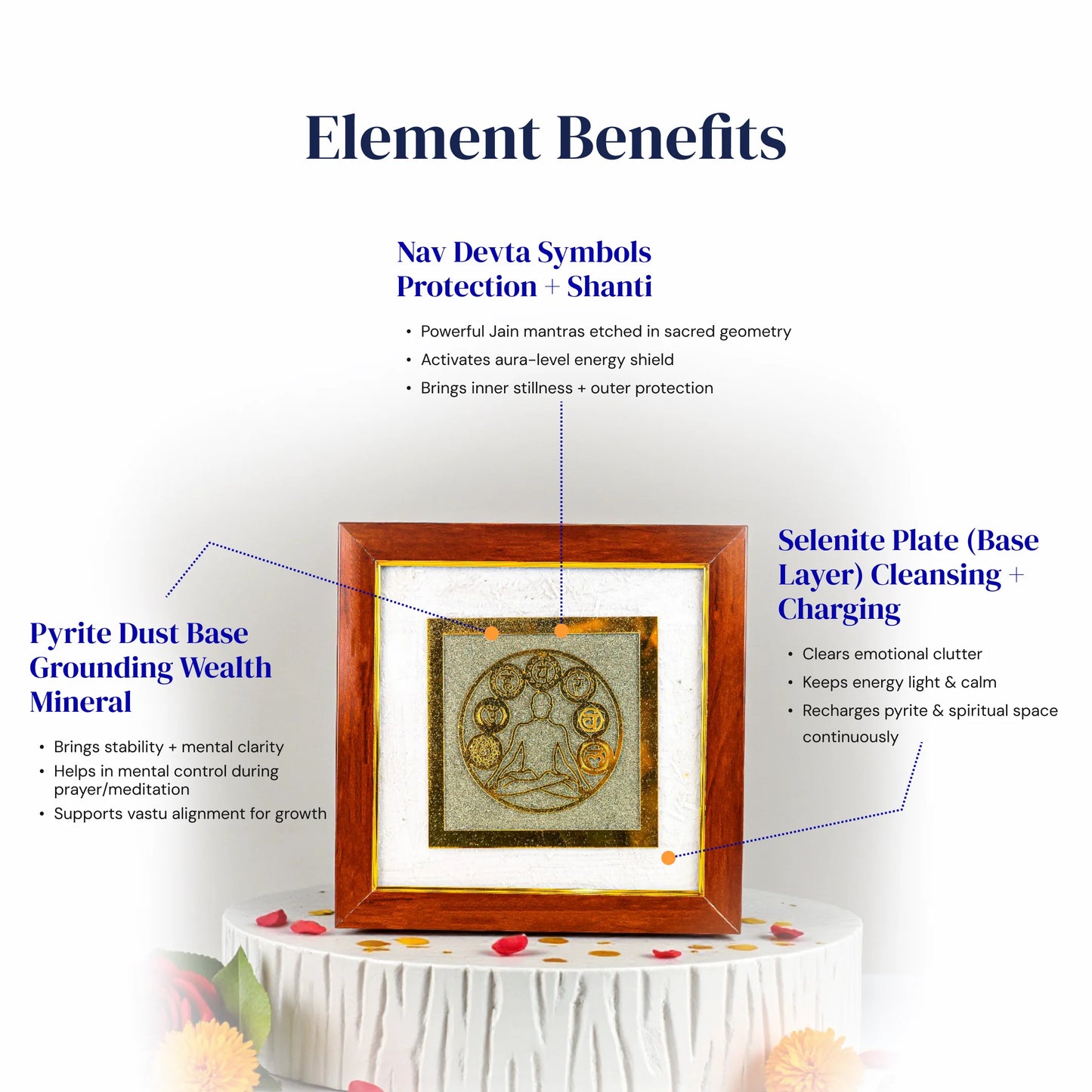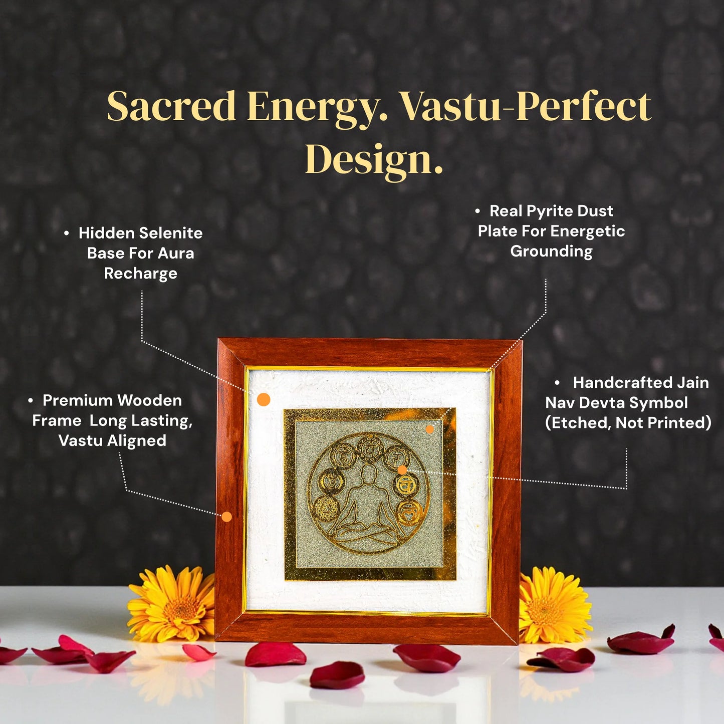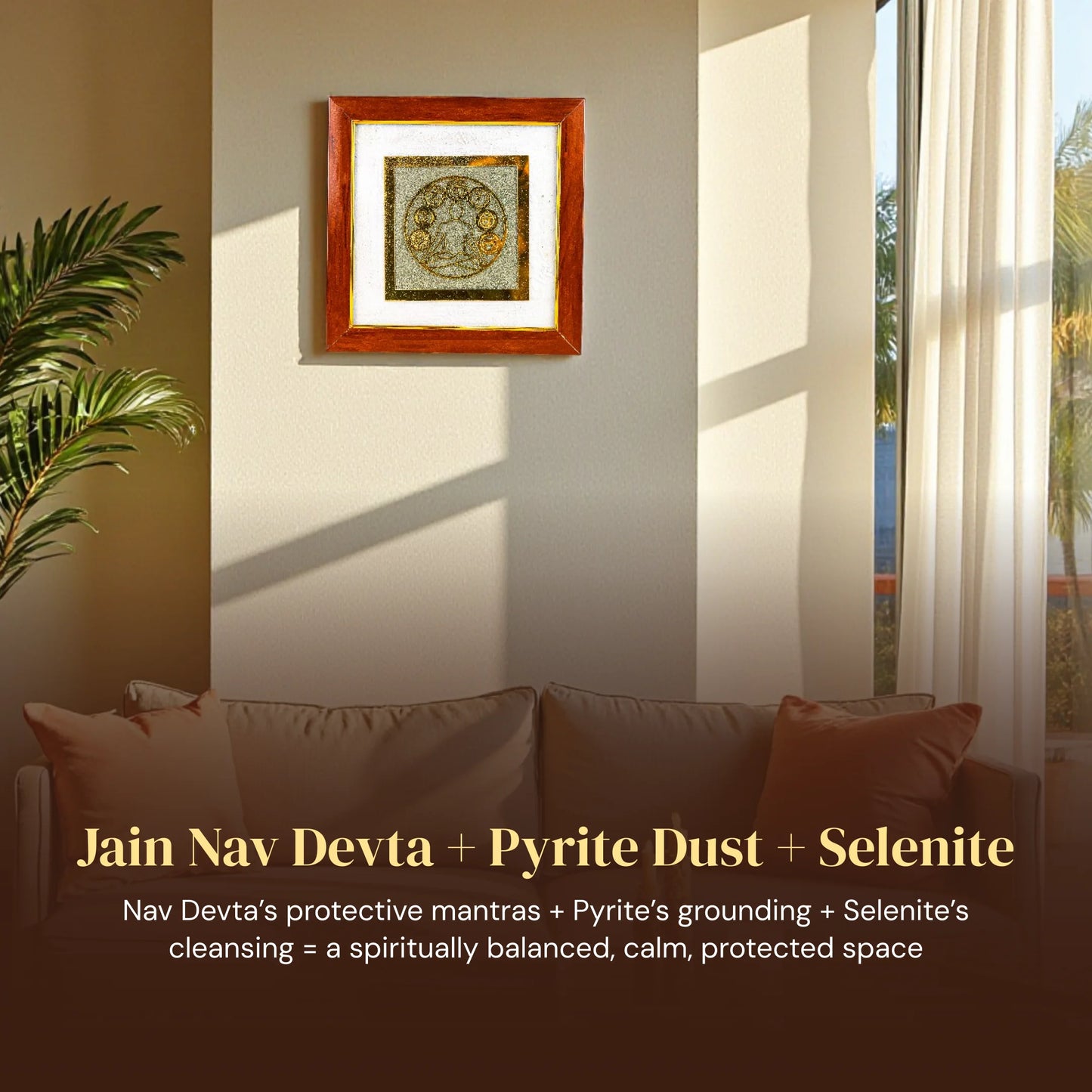 Yeh Jain Nav Devta frame un logon ke liye hai jo apne space me spiritual peace, protection aur clarity lana chahte hain. Nav Devta ka sacred symbol + pyrite dust focus aur inner strength activate karta hai. Niche chhupa selenite layer energy ko clean aur recharge karta hai, bina kisi effort ke.