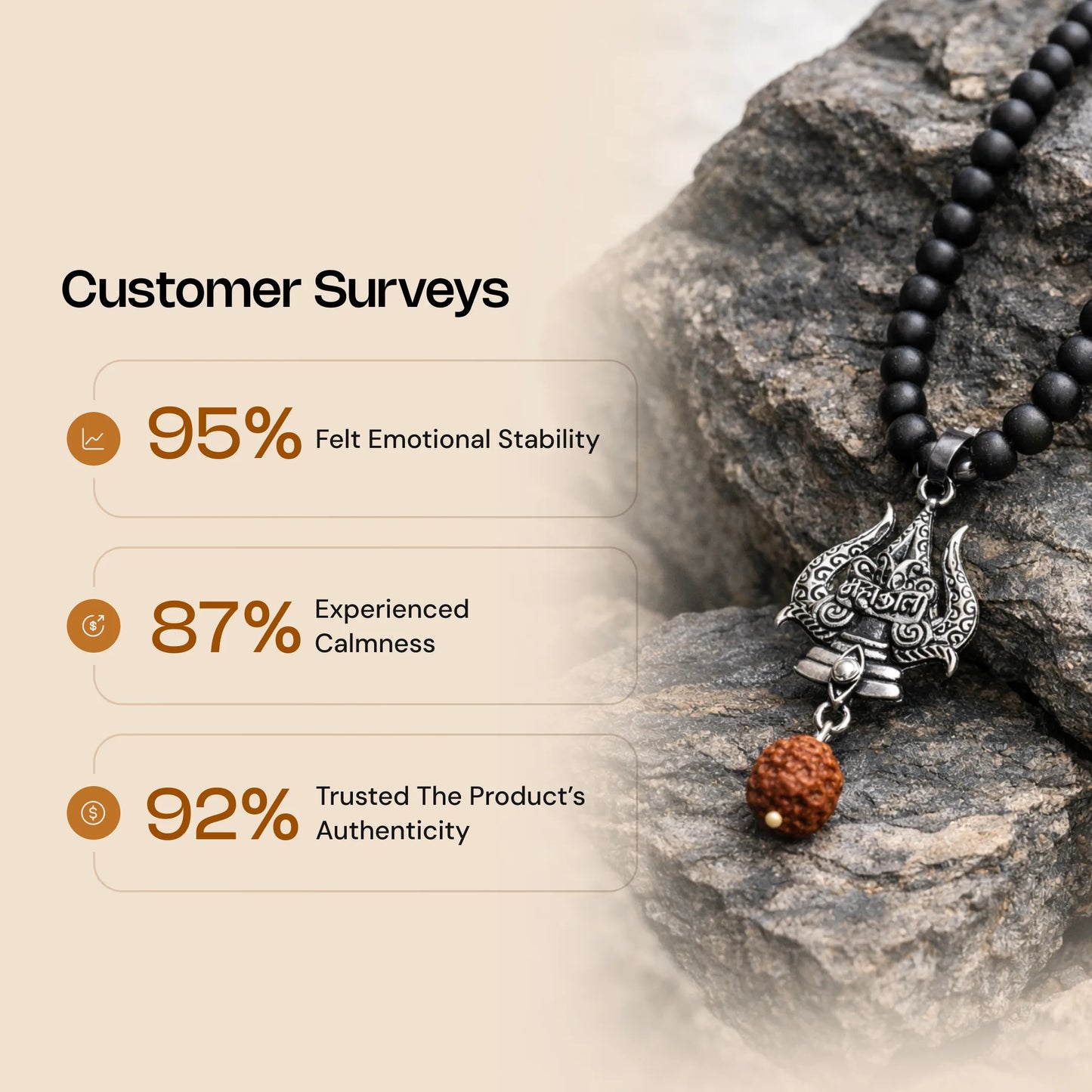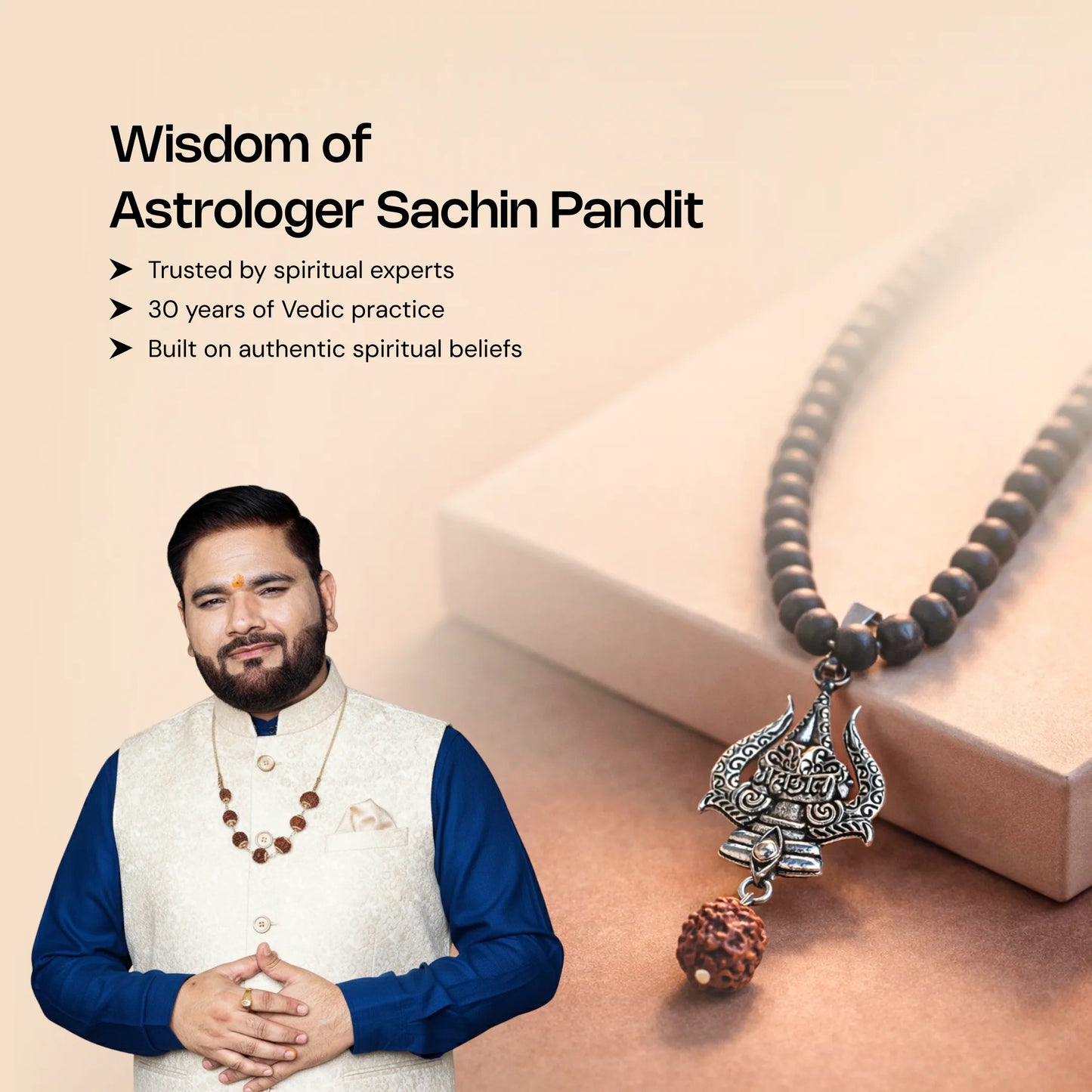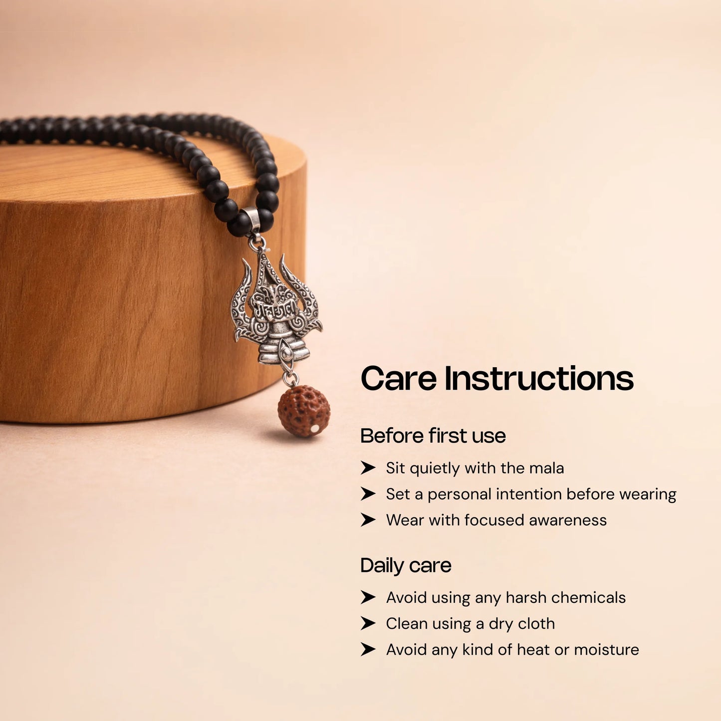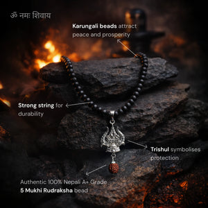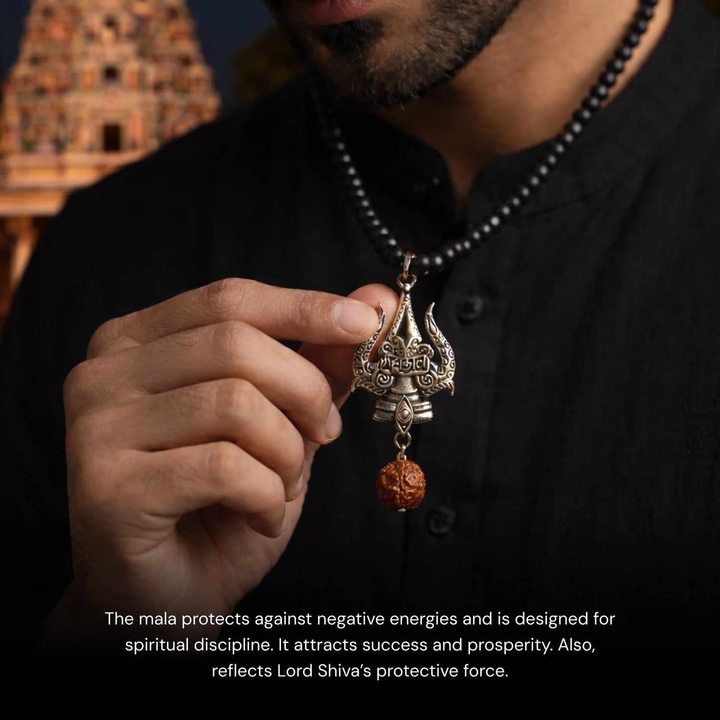 The Karungali Mala with Trishul and Rudraksha combines powerful beads to enhance spiritual strength and financial success. Karungali beads ground your energy, while Rudraksha beads offer spiritual protection and promote peace. The Trishul symbol boosts resilience and mental clarity, making this mala a tool for prosperity, protection, and inner strength.