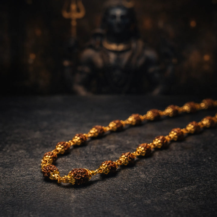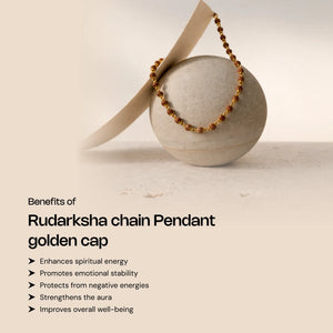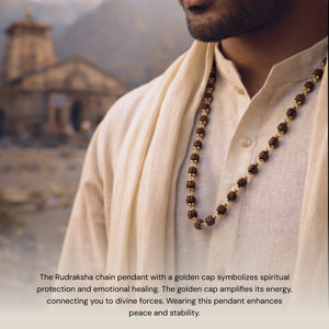 The Rudraksha Chain Pendant with Golden Cap brings peaceful strength and spiritual calm into your life. Made with sacred Rudraksha beads, it protects your energy, balances your emotions, and clears negative forces around you. Wearing it daily strengthens your aura, uplifts your spirit, and supports your overall well‑being so you feel more grounded, confident, and at peace.