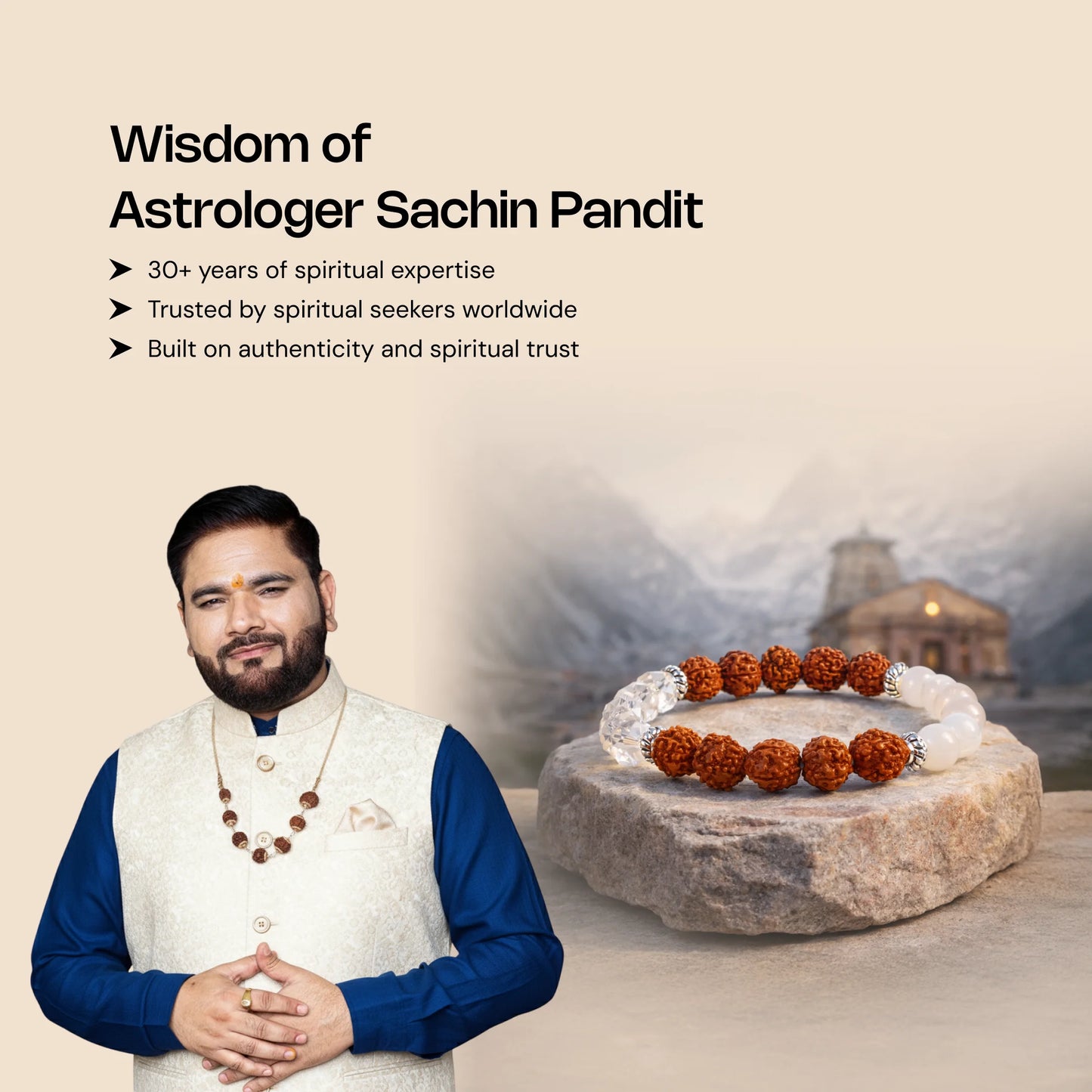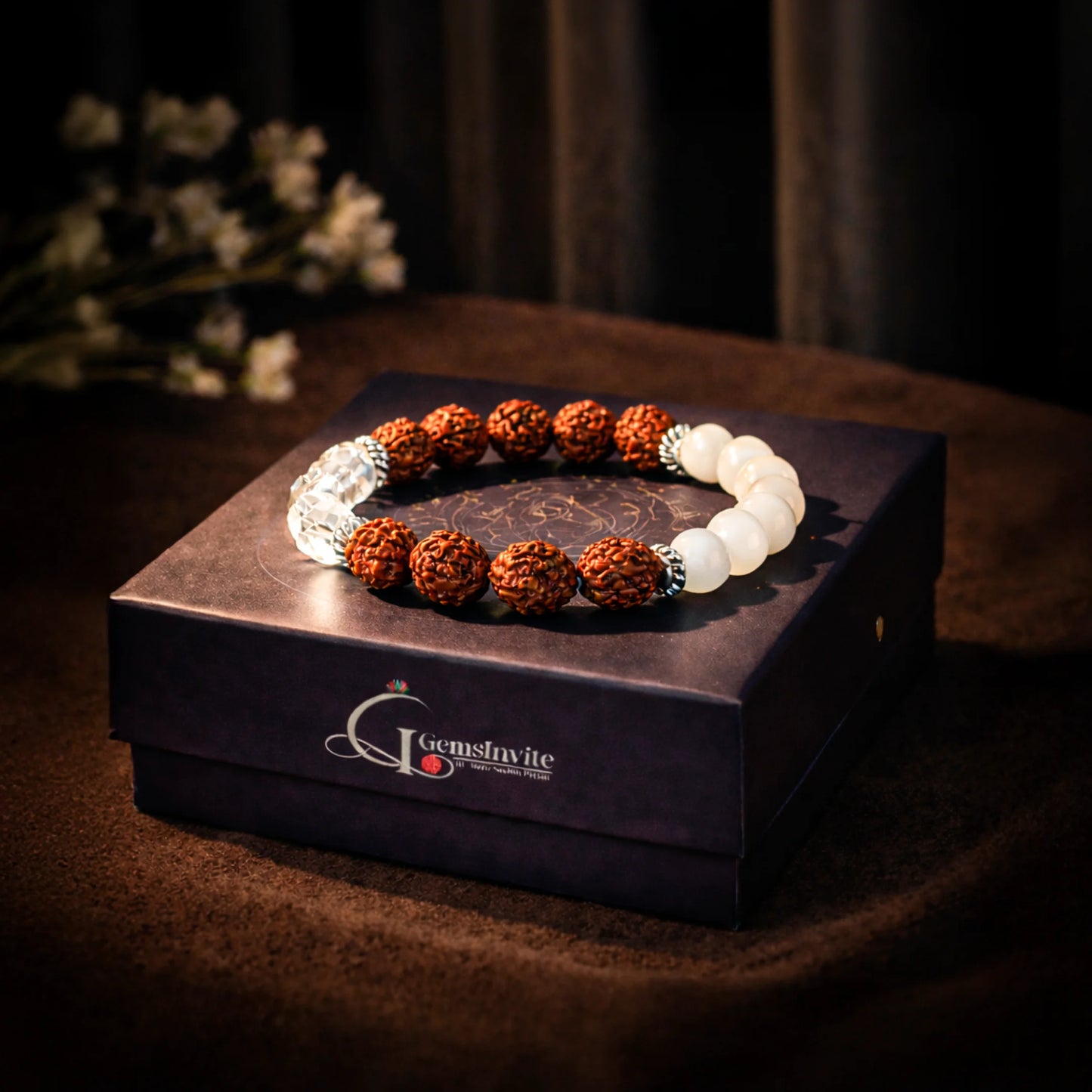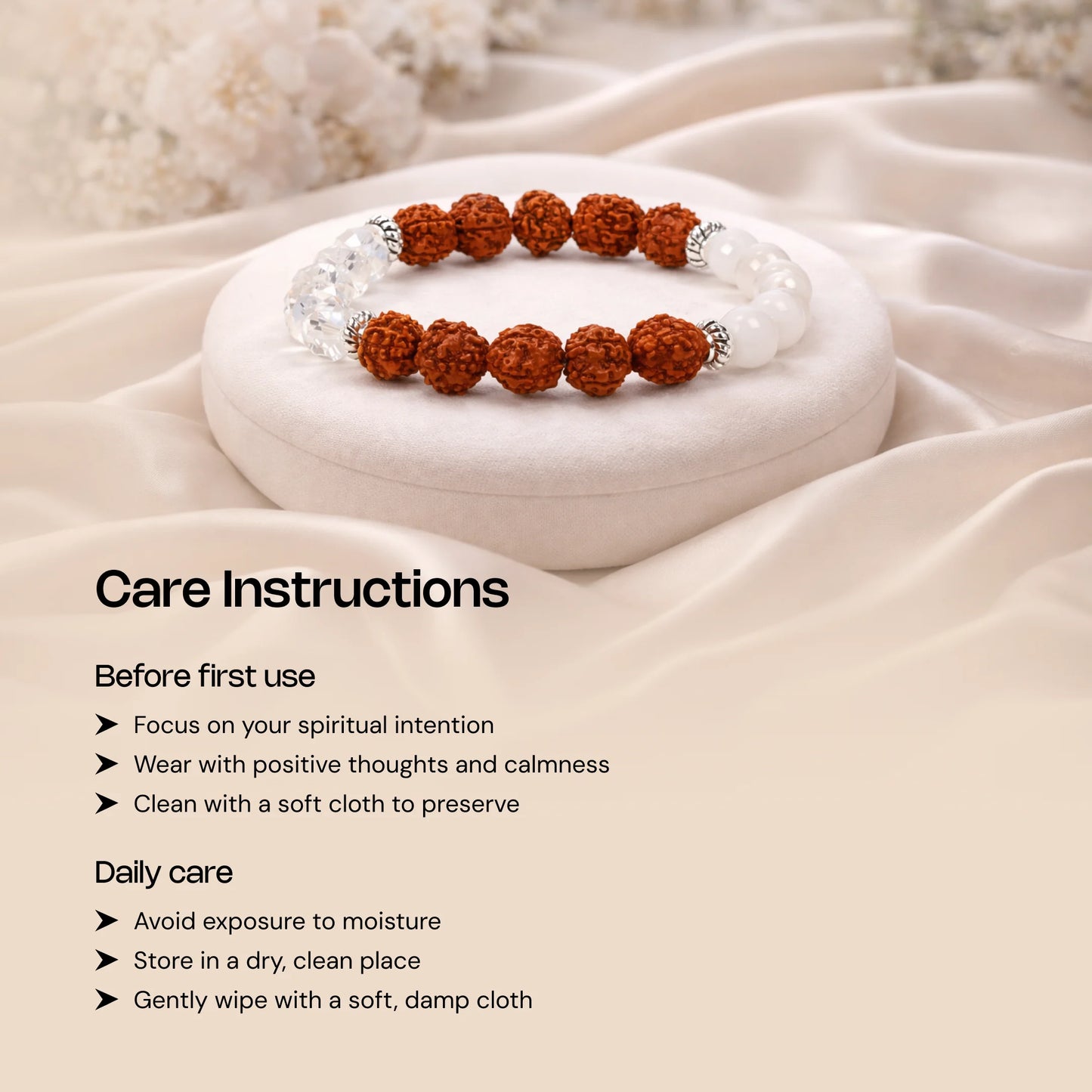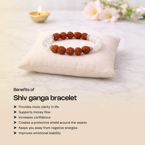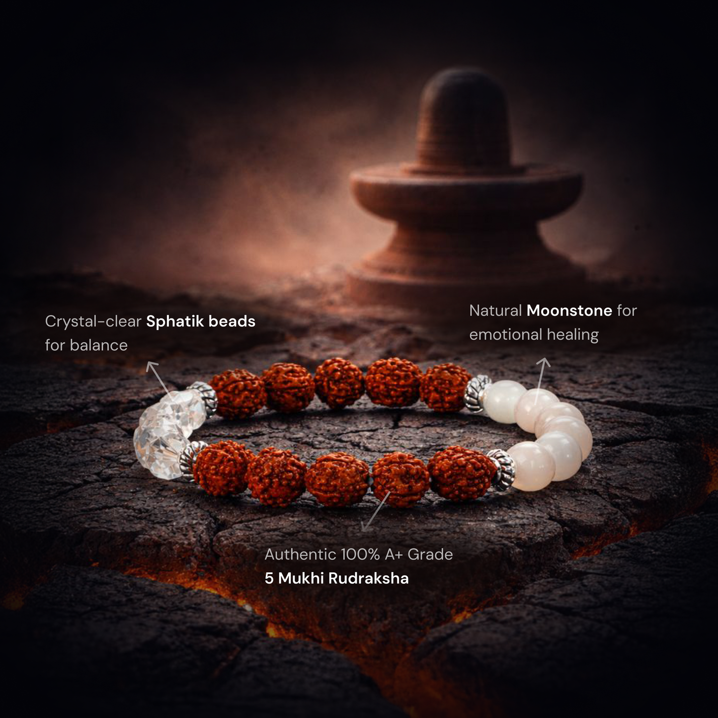 The Shiv Ganga Bracelet blends sacred A+ grade 5 Mukhi Rudraksha, calming Moonstone, and energy‑clarifying Sphatik beads to help your life feel more balanced and peaceful. Rudraksha grounds your spirit, Moonstone heals emotional stress, and Sphatik amplifies clarity and positive vibrations. Wear it daily to feel calmer, emotionally stronger, and naturally open to balanced living and prosperity‑focused energy.