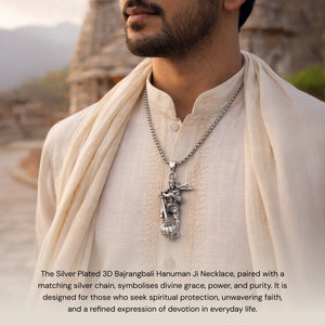 The Silver Plated 3D Bajrangbali Hanuman Ji Necklace brings Lord Hanuman’s divine strength close to your heart. Made for seekers of courage and peace, it shields you from negative energy, strengthens emotional balance, and deepens your spiritual focus. Wearing it daily enhances faith, calm confidence, and the inner power to face life’s challenges with resilience and devotion.