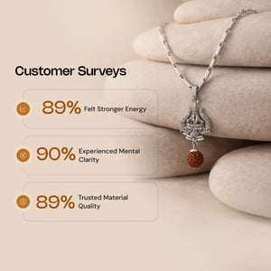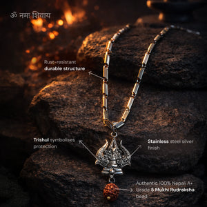 The Stainless Steel Silver Pendant with Rudraksha and Trishul symbolizes divine protection and inner strength. The Rudraksha bead offers spiritual peace and stability, while the Trishul (trident) acts as a shield, protecting against negative energies. This pendant is designed to enhance spiritual awareness, promote confidence, and provide constant protection in daily life.