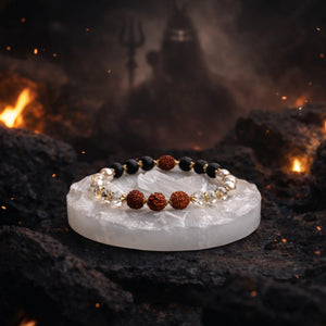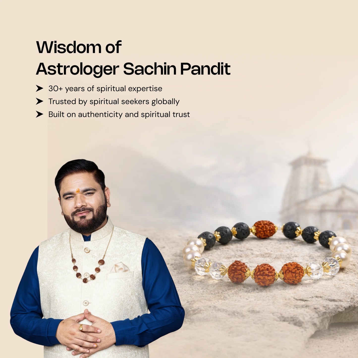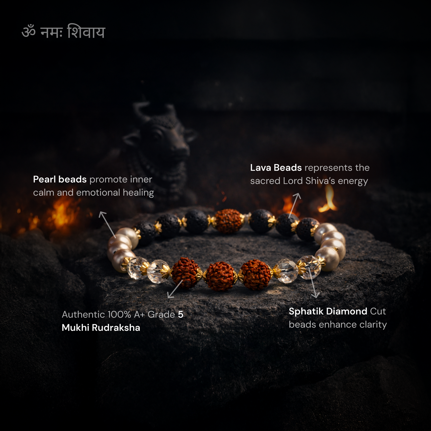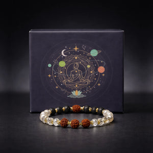 The Victory Bracelet combines the powerful energies of A+ grade 5 Mukhi Rudraksha, Pearl, Lava Beads, and Sphatik Diamond Cut to create a balanced, prosperous life. Rudraksha offers spiritual protection, while Pearls bring emotional healing. Lava Beads ground your energy, and Sphatik enhances clarity, helping you align your intentions with wealth, success, and peace.