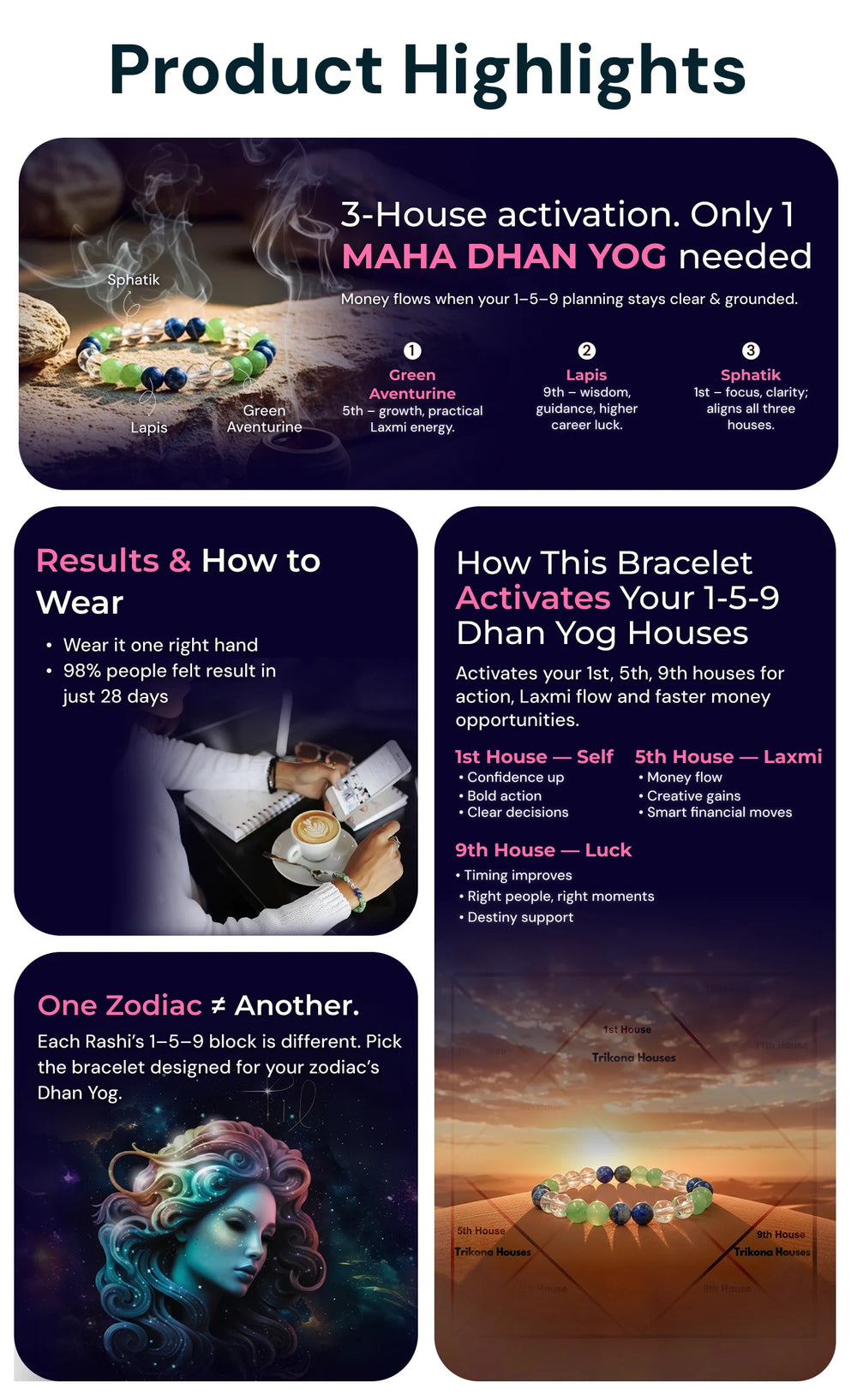 This Virgo Maha Dhan Yog bracelet is for people who work carefully, plan everything, but still feel stuck in money and career. It supports clear mind, confidence and practical growth, so your effort finally starts showing in your bank balance.